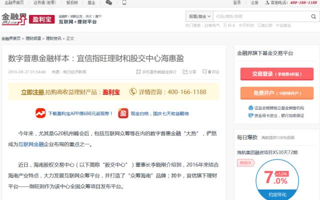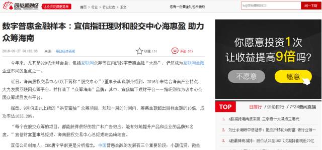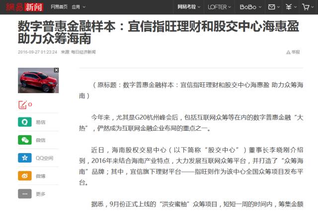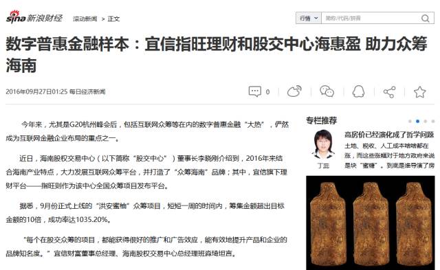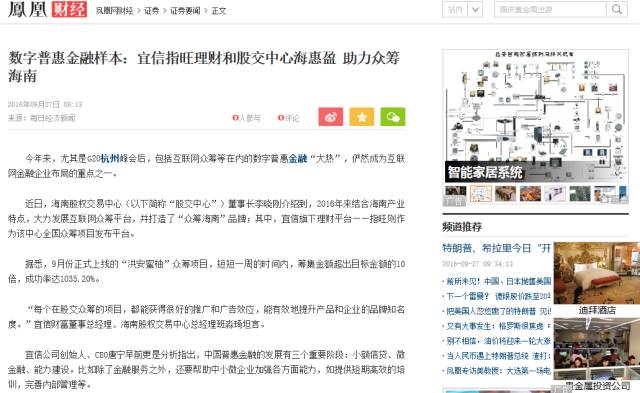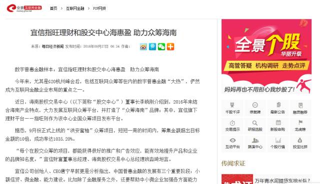 近日,海南股權(quán)交易中心(以下簡稱“股交中心”)董事長李曉剛介紹到,2016年來結(jié)合海南產(chǎn)業(yè)特點,大力發(fā)展互聯(lián)網(wǎng)眾籌平臺,并打造了“眾籌海南”品牌;其中,宜信旗下理財平臺——指旺則作為該中心全國眾籌項目發(fā)布平臺。