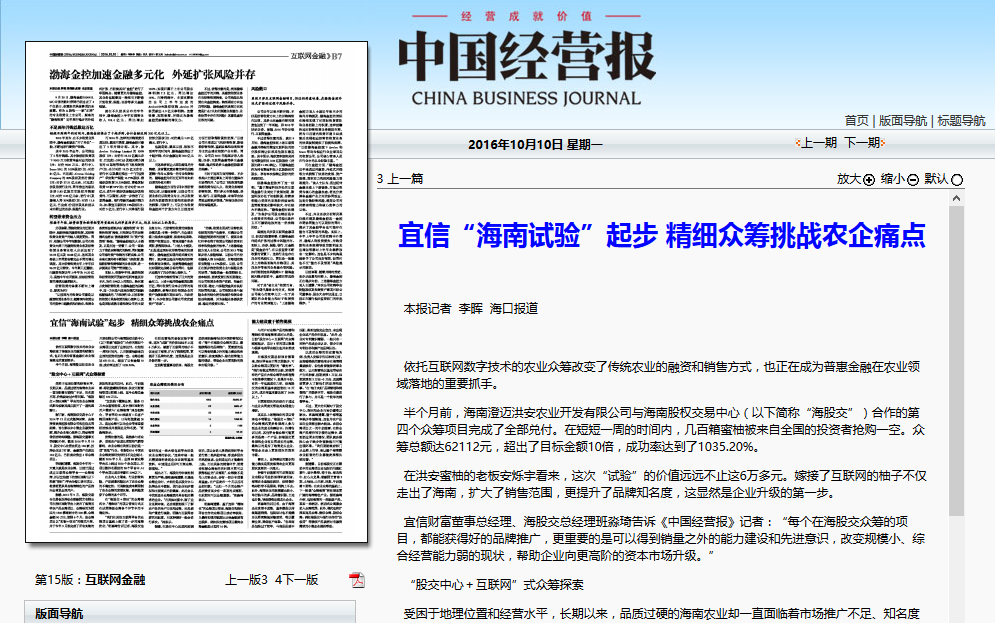 近日,國內最早發行經濟類的報刊之一《中國經營報》在其互聯網金融版上報道“眾籌海南”,文章以《宜信“海南試驗”起步 精細眾籌挑戰農企痛點》為題,表示依托互聯網數字技術的農業眾籌改變了傳統農業的融資和銷售方式,也正在成為普惠金融在農業領域落地的重要抓手。