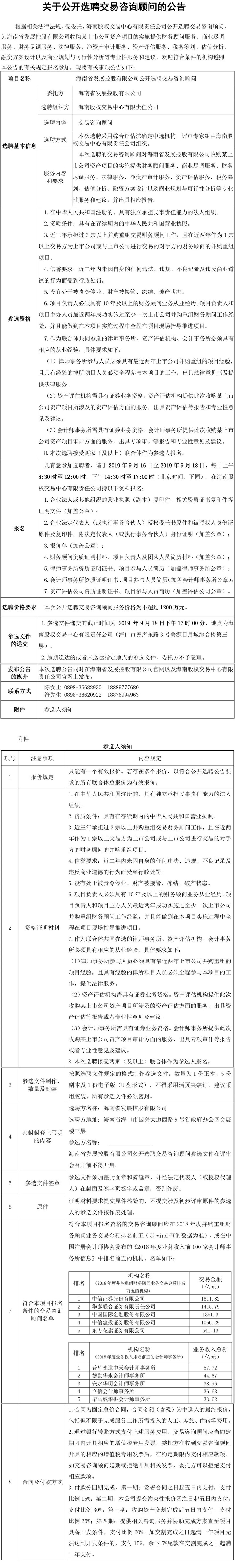 【公開選聘】海南省發展控股有限公司公開選聘交易咨詢顧問