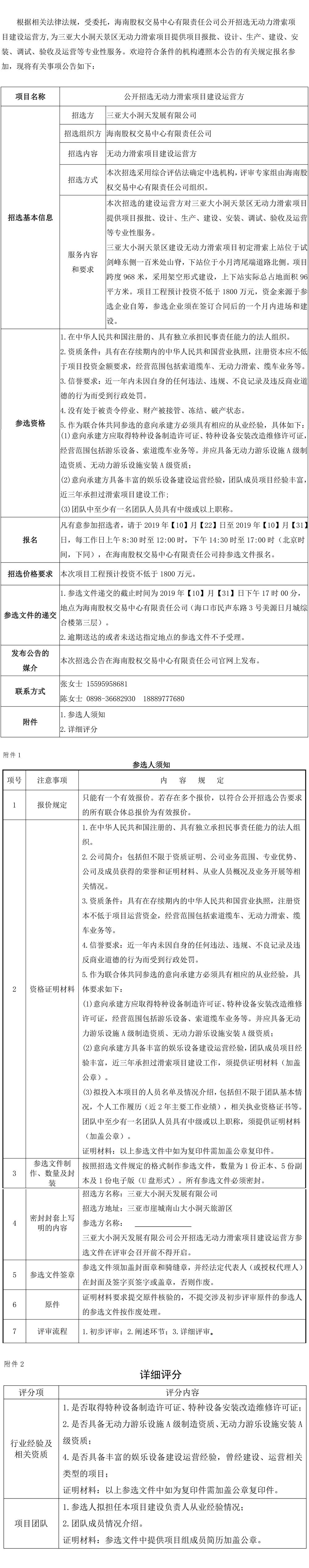 三亞大小洞天發展有限公司公開招選無動力滑索項目建設運營方