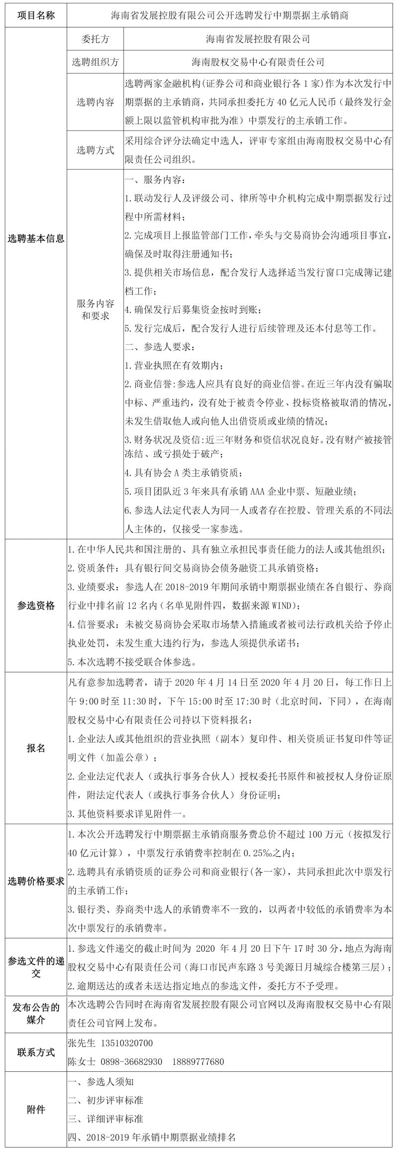 根據相關法律法規,受委托,海南股權交易中心有限責任公司公開選聘發行中期票據主承銷商,為中期票據發行提供相關服務。歡迎符合條件的商業銀行,證券公司遵照本公告的有關規定報名參加,現將有關事項公告如下: