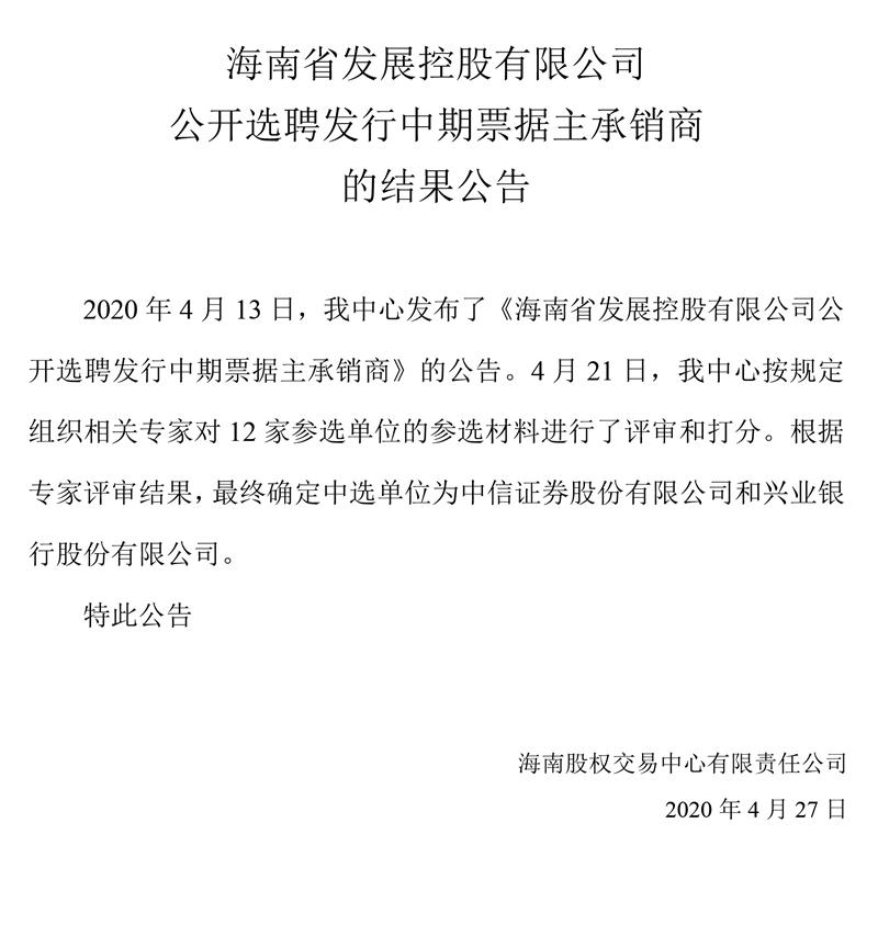 海南省發展控股有限公司公開選聘發行中期票據主承銷商的結果公告