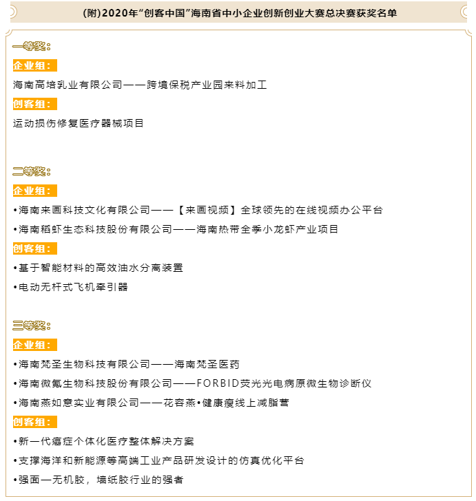 逐夢自貿(mào)港,創(chuàng)贏海之南。8月26日下午,由海南省工業(yè)和信息化廳、海南省財政廳主辦,海南股權(quán)交易中心承辦、深圳證券信息有限公司、陵水互聯(lián)網(wǎng)創(chuàng)業(yè)產(chǎn)業(yè)園協(xié)辦的2020年“創(chuàng)客中國”海南省中小企業(yè)創(chuàng)新創(chuàng)業(yè)大賽總決賽暨項目融資路演在海口舉行。通過2天近15個小時的路演和現(xiàn)場答辯,30強(qiáng)項目現(xiàn)場PK、同臺競技,最終,“跨境保稅產(chǎn)業(yè)園來料加工”和“運動損傷修復(fù)醫(yī)療器械”項目分獲海南賽區(qū)決賽企業(yè)組和創(chuàng)客組一等獎。