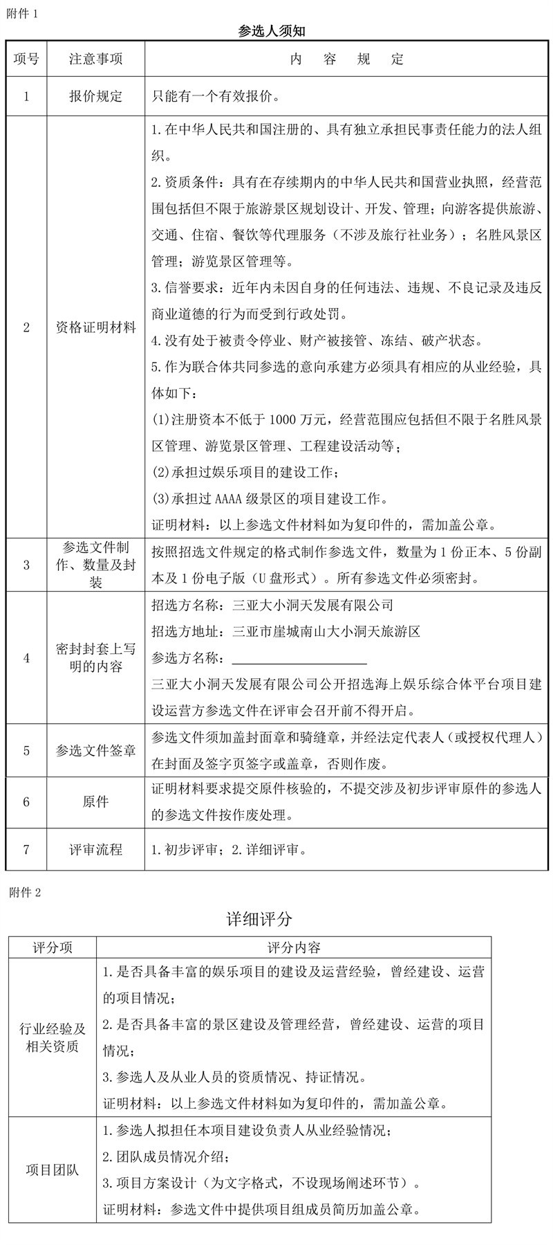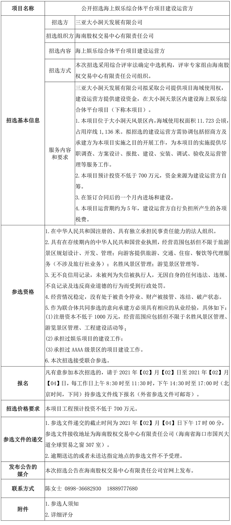 根據(jù)相關(guān)法律法規(guī),受委托,海南股權(quán)交易中心有限責(zé)任公司公開招選海上娛樂綜合體平臺項目建設(shè)運營方,為三亞大小洞天景區(qū)的海上娛樂綜合體平臺項目提供盡職調(diào)查、項目報批、建設(shè)、生產(chǎn)、安裝、調(diào)試、驗收及運營管理等服務(wù)工作。歡迎符合條件的機構(gòu)遵照本公告的有關(guān)規(guī)定報名參加,現(xiàn)將有關(guān)事項公告如下: