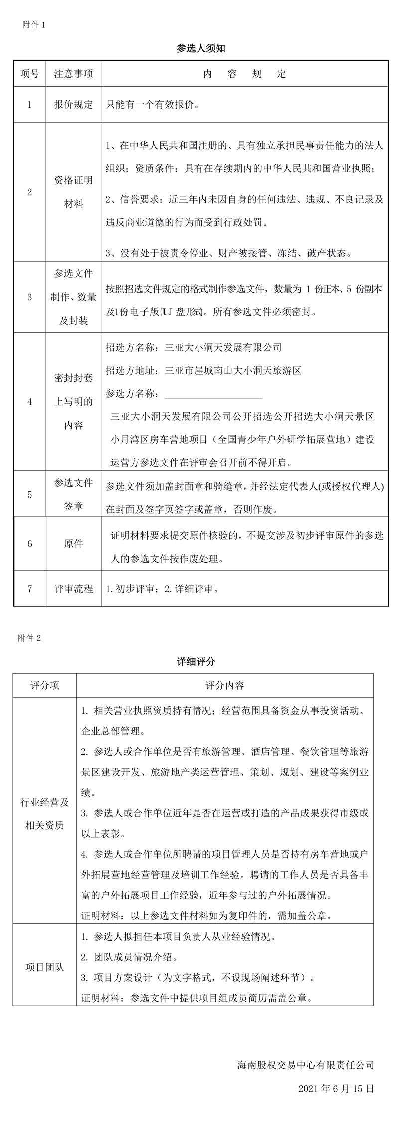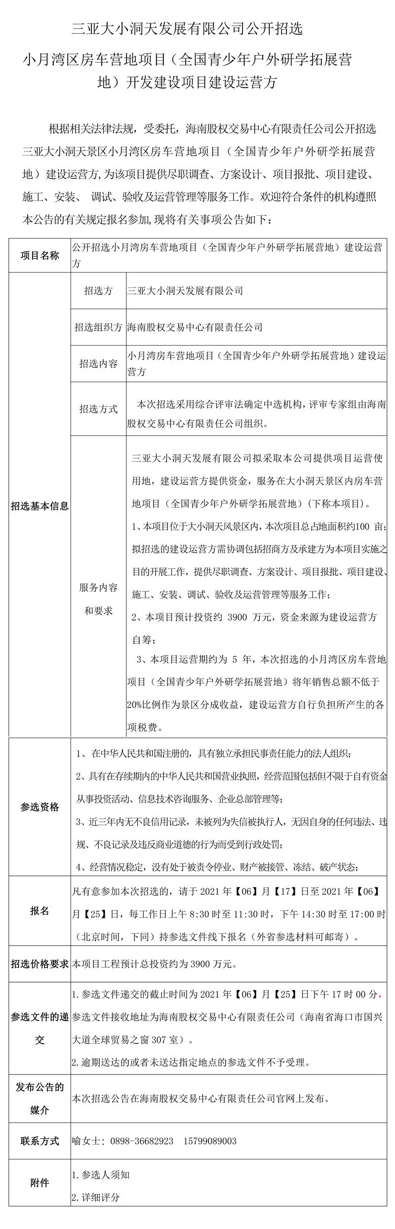 三亞大小洞天發展有限公司公開招選 小月灣區房車營地項目(全國青少年戶外研學拓展營地)開發建設項目建設運營方