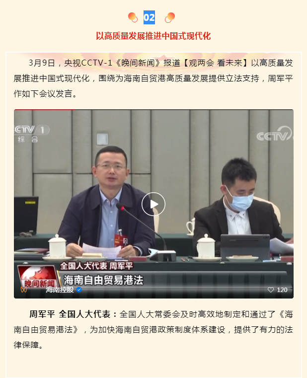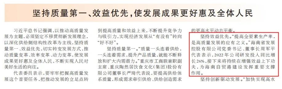 “提高全要素生產率,是高質量發展的應有之義。”海南省發展控股有限公司黨委書記、董事長周軍平代表表示,2022年公司研發投入同比增長26%,接下來將持續在增強效益上下功夫,為海南自貿港建設發揮重要支撐作用。