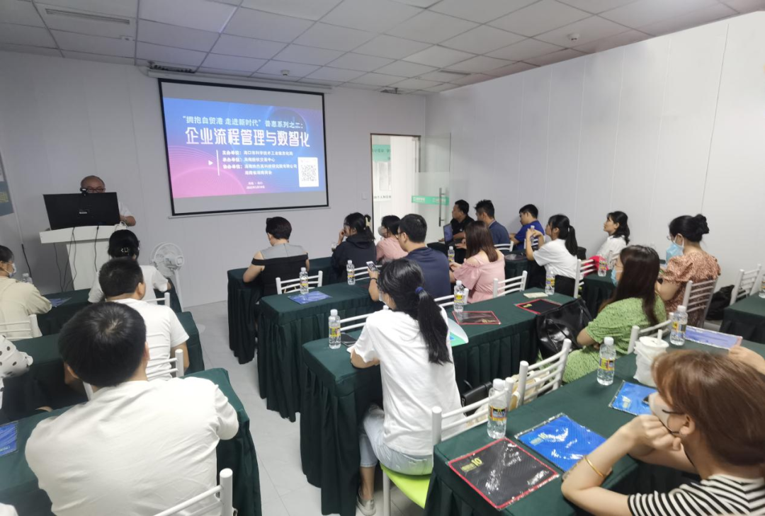 活動在海口周昌大廈舉行,由海南知與行信息技術有限公司創始人王義/總經理向我省中小企業分享企業企業流程管理與數智化知識,幫助企業提升流程化管理的合法性與科學性。約30家企業到場參加培訓。