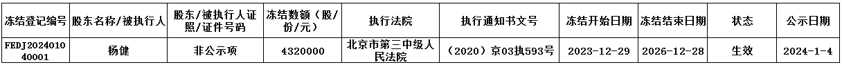 依據北京市第三中級人民法院《協助執行通知書》[(2020)京03執593號],我中心為海南臨高農村商業銀行股份有限公司(企業代碼:893508)股東楊健辦理股權凍結登記,具體情況如下: