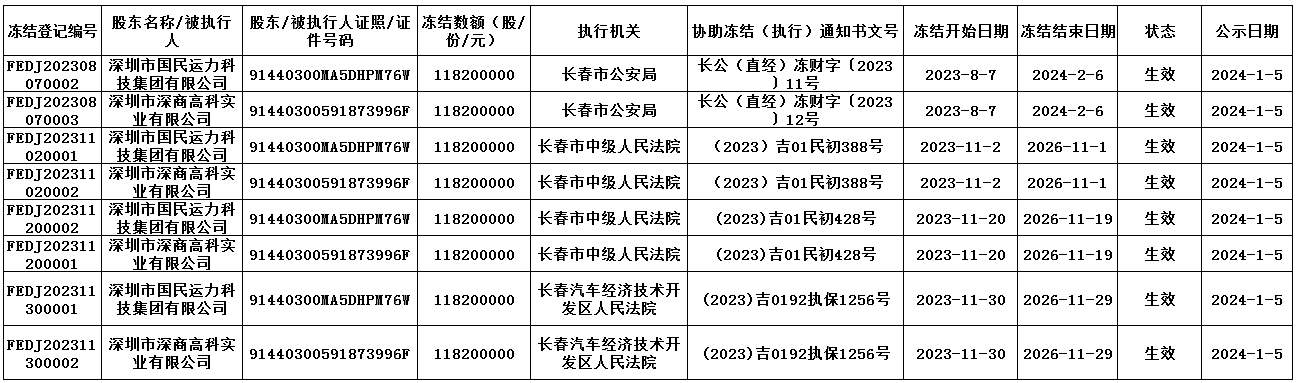 依據長春市公安局《協助凍結財產通知書》[長公(直經)凍財字〔2023〕11號)]、長春市人民法院《協助執行通知書》[(2023)吉01民初388號]及長春汽車經濟技術開發區人民法院[(2023)吉0192執保1256號]等文件,我中心為海口聯合農村商業銀行股份有限公司(企業代碼:893529)股東深圳市國民運力科技集團有限公司、深圳市深商高科實業有限公司辦理股權凍結/股權輪候凍結登記,具體情況如下: