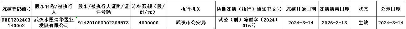 依據武漢市公安局《協助凍結財產通知書》[武公(刑)凍財字〔2024〕016號]文件,我中心為海南昌江長江村鎮銀行股份有限公司(企業代碼:893521)股東武漢水墨清華置業發展有限公司辦理股權凍結登記,具體情況如下: