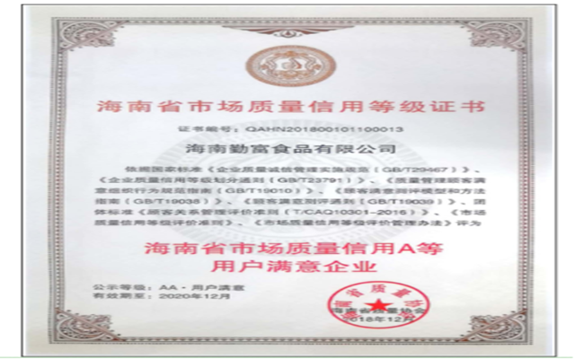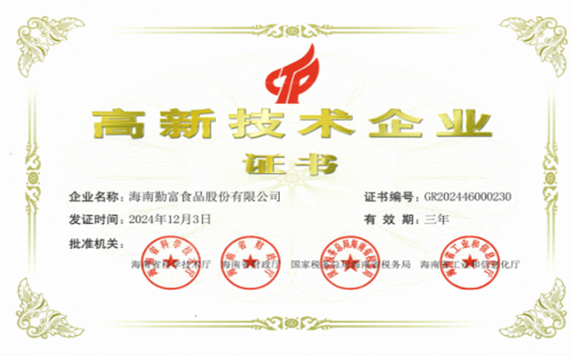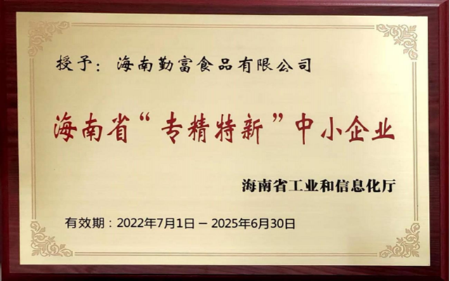 海南勤富食品股份有限公司2018年獲得海南省科技產業十大影響力領軍企業;連續獲得海南省第七屆、第八屆、第九屆優秀企業;連續獲得海南省第五屆、第六屆、第七屆杰出民營企業;2019年獲得文昌市脫貧攻堅工作先進單位。