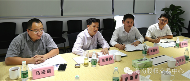 4月13日下午,由海南省人民政府研究室副主任熊安靜帶隊的省金融辦、省旅游委調研組一行,到海南股權交易中心走訪調研。海南股權交易中心董事長李曉剛,組織各部門負責人召開座談會,詳細介紹了本中心的運行情況。